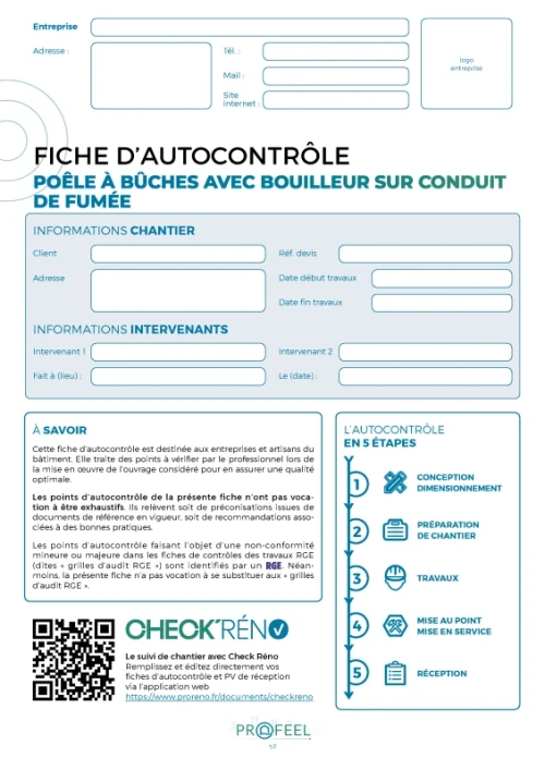 La fiche d’autocontrôle “Poêle à bûches avec bouilleur” est un outil pratique pour assurer la conformité et la qualité des installations. Elle facilite l’autocontrôle des travaux en identifiant les points clés à vérifier à chaque étape d’un chantier de rénovation énergétique.