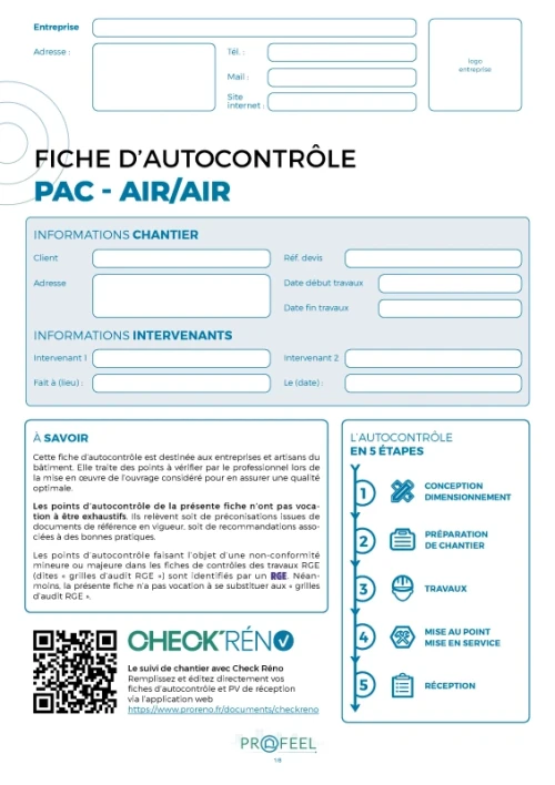 La fiche d’autocontrôle “Pompe à chaleur - PAC Air / Air” est un outil pratique pour assurer la conformité et la qualité des installations. Elle facilite l’autocontrôle des travaux en identifiant les points clés à vérifier à chaque étape d’un chantier de rénovation énergétique.