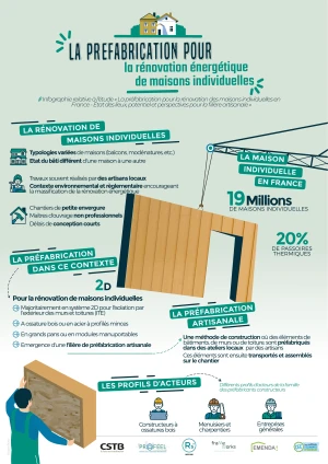 La préfabrication se développe largement dans la construction neuve, mais qu'en est-il pour la rénovation énergétique de maisons individuelles ? Cette étude s'attelle à dresser un état des lieux en détaillant les systèmes les plus propices à ce marché et les perspectives et le potentiel pour la filière artisanale.